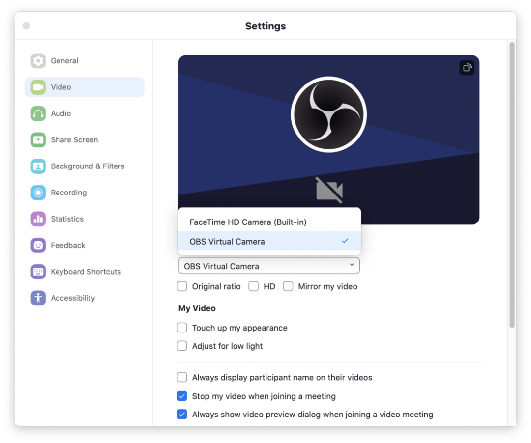 可以看到除了原先的「FaceTime HD Camera」之外,现在还多出了一个「OBS Virtual Camera」的选项,这就是通过 OBS 软件输出的视频。
