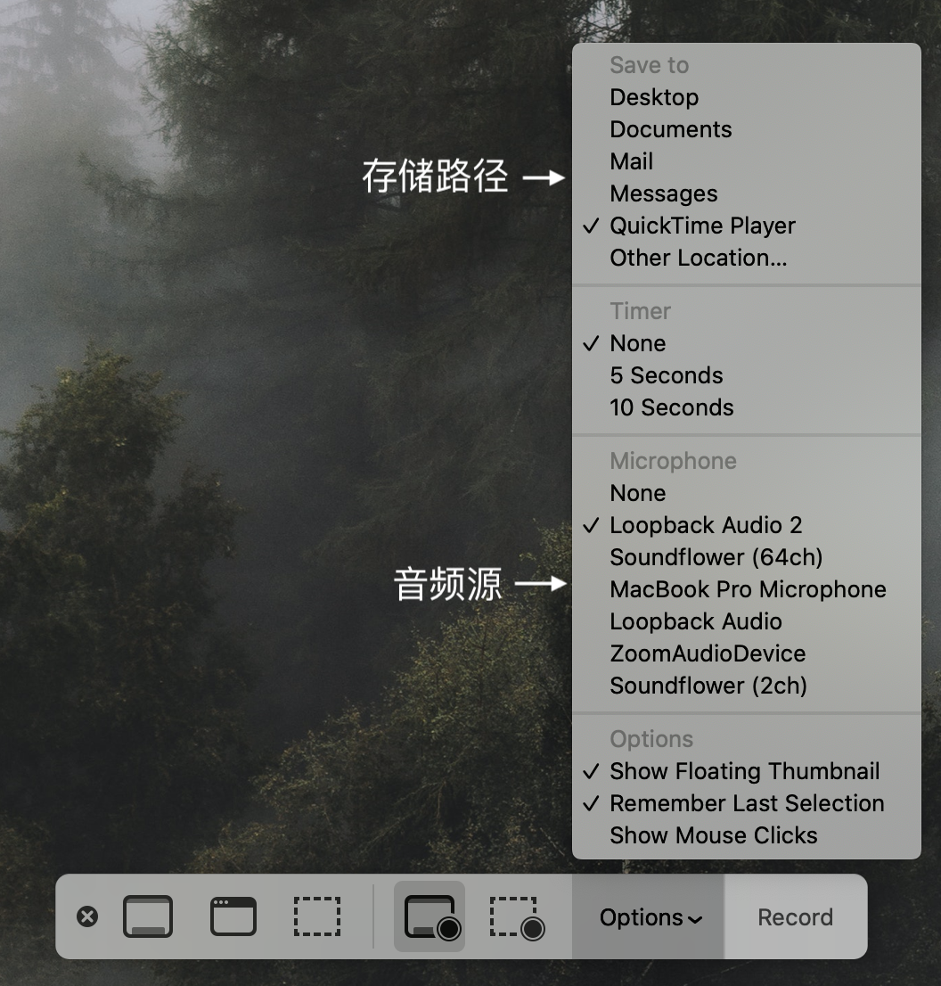 打开 QuickTime 和 Loopback。「新建屏幕录制」。