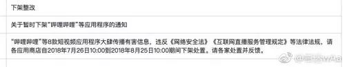 7月26日消息,网上流出的一则“关于暂时下架哔哩哔哩等应用程序的通知”截图显示,B站等8款视频应用因传播有害信息,违反《网络安全法》《互联网直播服务管理规定》等法律法规,各应用商店自2018年7月26日到2018年8月25日期间下架处置。