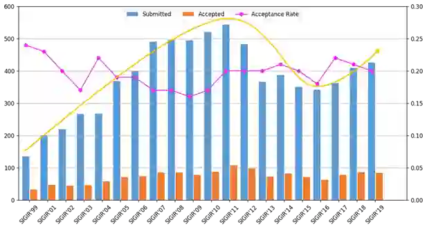 据悉,今年 SIGIR 论文投稿创历史新高,共收到论文投稿总数 1180 篇,总共录取 340 篇。其中,共收到 555 篇长文投稿,仅有 147 篇长文被录用,录用率约 26%;共收到了 507 篇短文投稿,录用 153 篇,录取率为 30%。来自 32 个国家的 1221 名作者为录用论文做出了贡献。