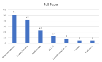 从不同主题的投稿数量可以看出,投稿数最多的主题分别是推荐,搜索/排名,应用,AI及信息检索,基础及未来,评估。其中Recommendation 占了最大的比重,投稿量和接收量仍然最多;由于 Ranking 和 Search 属于 AI 非常关注的问题,所以比重也很大,Foundation、Human 和 Evaluation 持续小众。