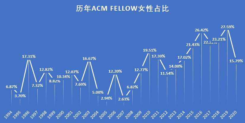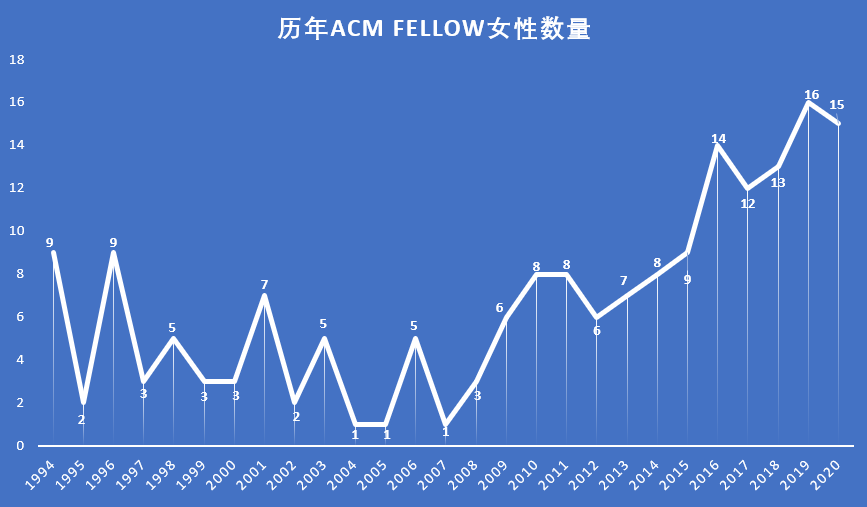 通过统计历年来 ACM Fellow 女性学者的数量,可以发现从 1994 年到 2007 年,女性数量稳中略有下降,而从 2007 年之后,则一路攀升,在 2019 年和 2020 年达到了 16 和 15 位的高峰。