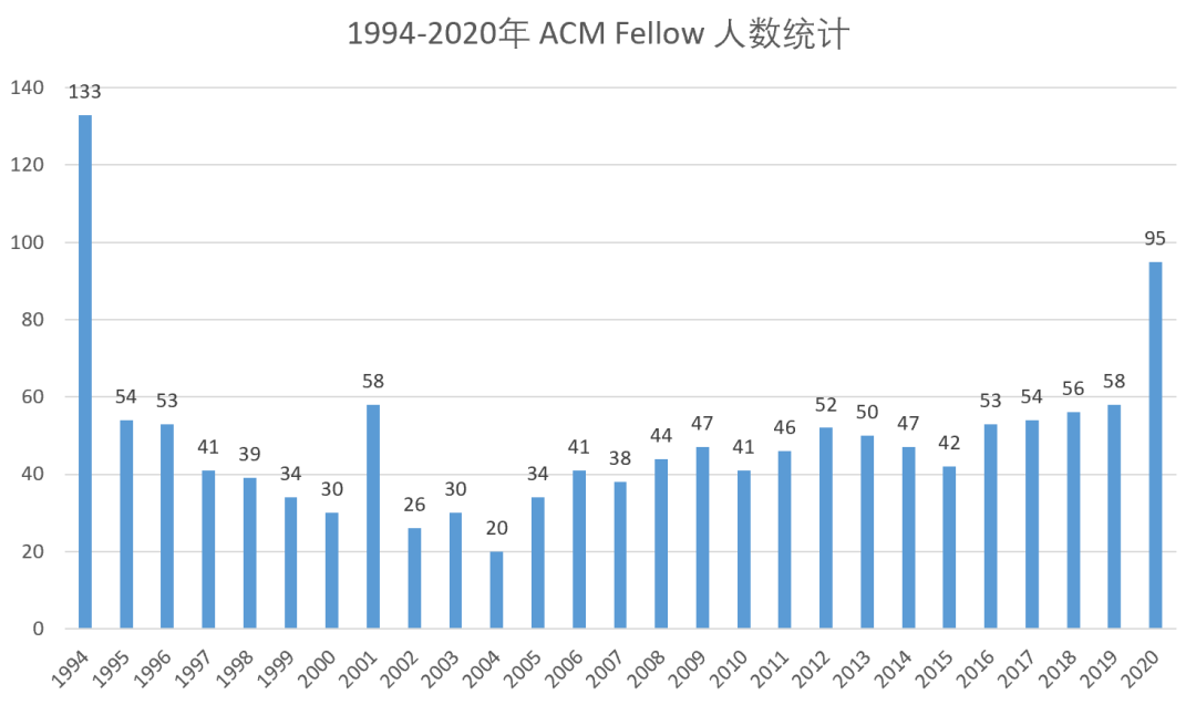 而在2020年的 95 人中,就包括 12 名华人学者。至此,1994-2020 年总共有 68 名华人学者当选 ACM Fellow。而且仅在 2011 年至 2020 年十年内,就有 52 名华人学者当选,占当选总人数约十分之一。