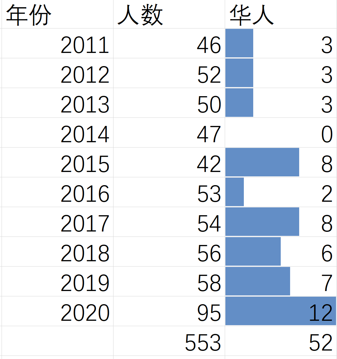此外,通过分析历年学者信息,华人人数占比整体也呈增加趋势——从 2011、2012、2013、2016 年的 6.52%、5.77%、6%、3.77%,增加到了 2015、2017、2018、2019、2020 的 19.05%、14.81%、10.71%、12.07%、12.63%。