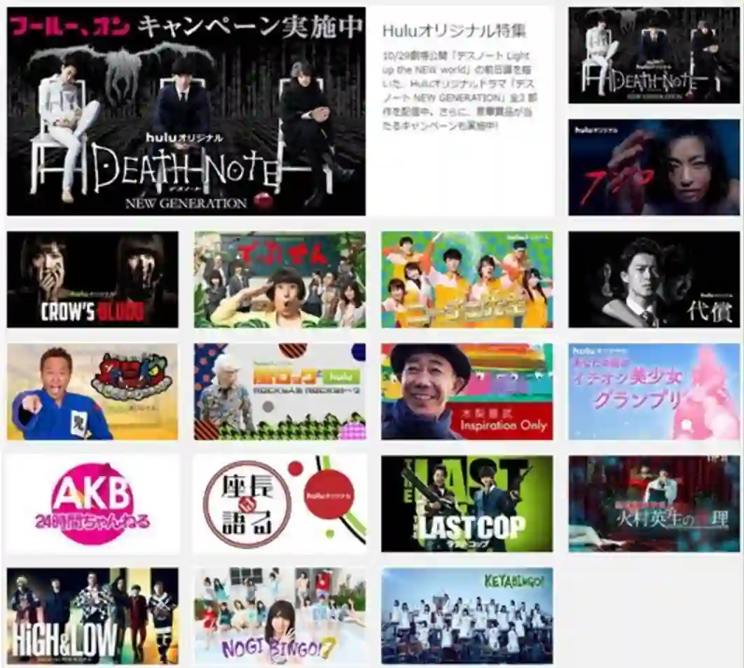 Hulu被卖后,逐渐变成日本电视台的官方视频平台。为了给日本电视台制作的《死亡笔记Light up the NEW world》电影造势,Hulu先播出三集前传迷你剧《死亡笔记 NEW GENERATION》;松坂桃李主演的《视觉侦探日暮旅人》电视播出结束后,在Hulu上播出了全长3集的原创故事《尸体的去向》。
