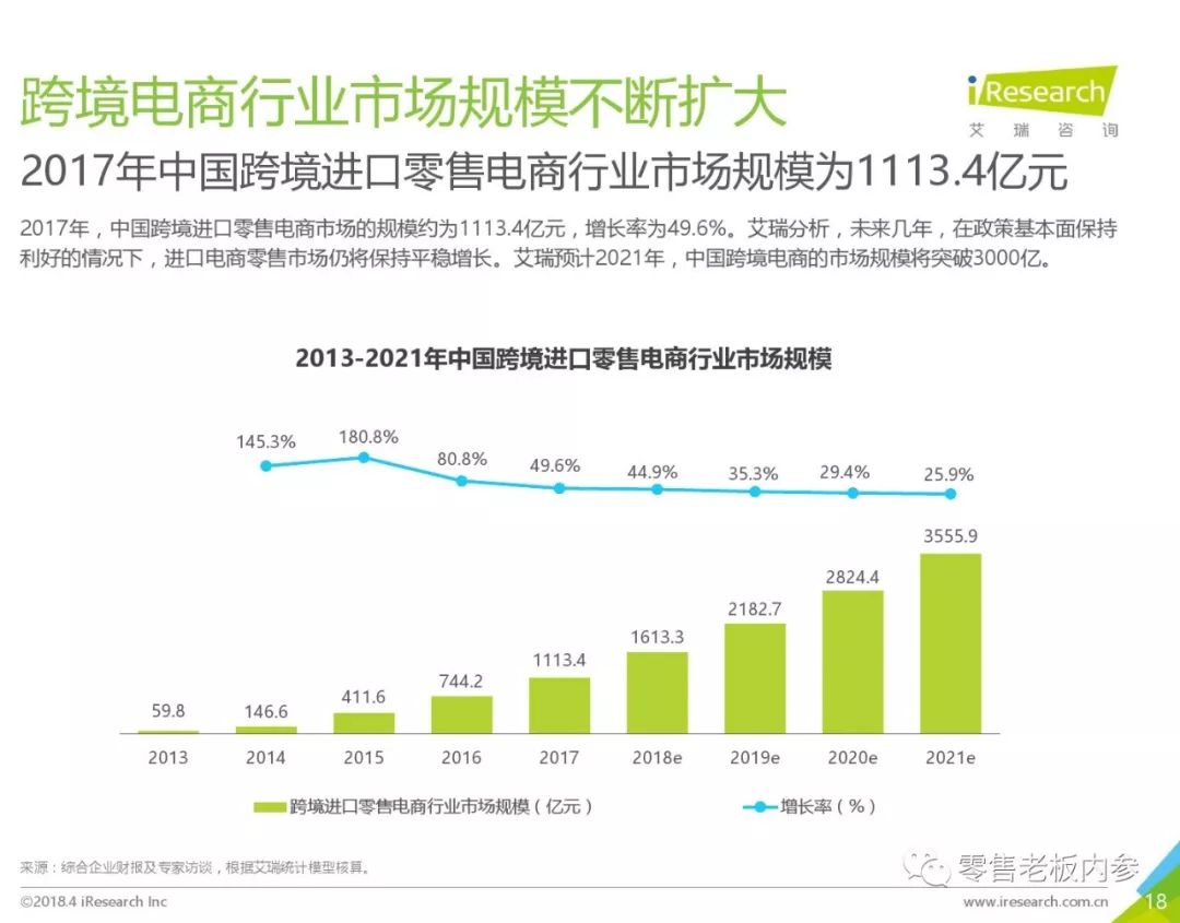 据艾瑞发布的研究报告称,2017年中国跨境进口零售电商市场规模达1113.4亿元,增长率为49.6%。预计2020年,中国跨境电商市场规模将突破3000亿。