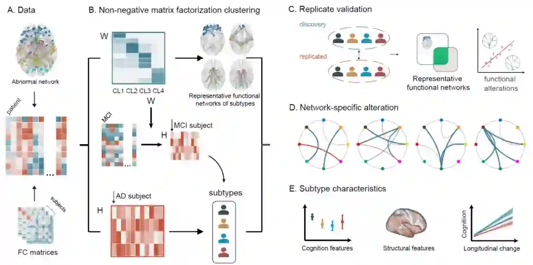 该研究采用国内多家医院合作建立的MCAD数据库和美国ADNI公开数据库的共1100例数据进行了系统研究。基于前期发现的AD异常脑网络(Jin et al, 2020),使用非负矩阵分解(NMF)方法将AD患者聚类得到不同的AD亚型,随后对各个亚型的功能异常、结构萎缩和纵向改变进行了评估。基本研究框架如下(图1):