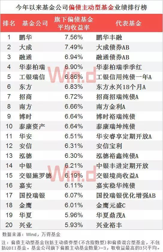 我们选出各家旗下偏债主动型基金业绩最好的三只基金今年以来收益率求平均得出,鹏华旗下偏债主动型基金业绩表现最优,平均收益率为7.56%,其次是大成基金,7.49%。
