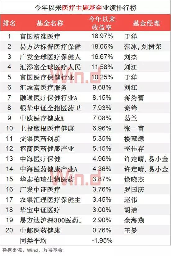 管理富国精准医疗的基金经理于洋排名第一,平均收益率达18.3%。前20名中,李娜管理的基金最多,7只,平均收益率达3.86%,代表基金交银领先回报。