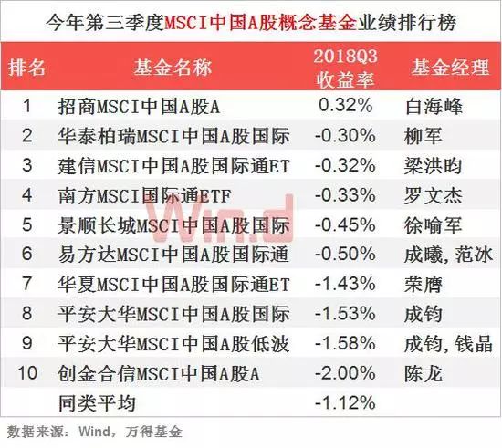 在万得A股纳入MSCI概念主题基金分类全部18只基金中,我们只取2018年6月30日之前成立的基金,表现较好的分别是招商MSCI中国A股A、华泰柏瑞MSCI中国A股国际和建信MSCI中国A股国际通ETF,收益分别是0.32%、-0.30%和-0.32%。