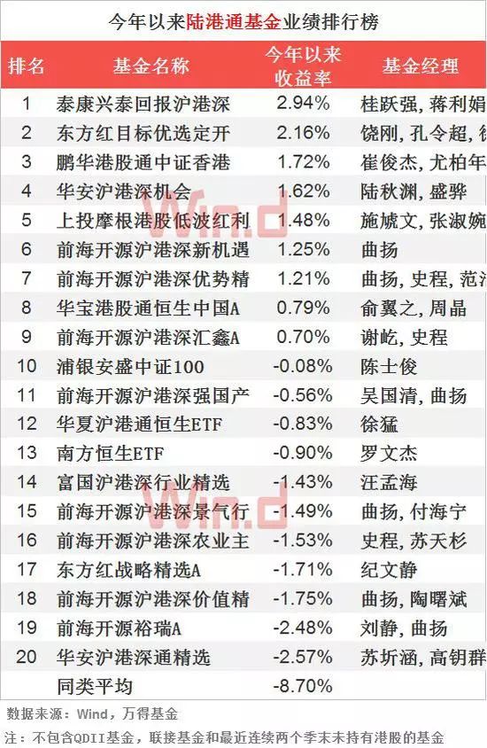 在万得陆港通概念类基金全部120只基金中,整体业绩相对去年表现平平,其中泰康兴泰回报沪港深基金业绩表现最佳,收益率为2.94%。