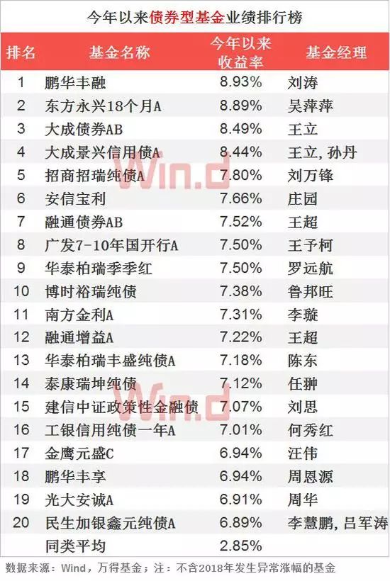 由于近年债券违约事件频发,信用利差走阔,故而债券基金业绩持续攀升,业绩表现最好的债基为鹏华丰融,收益率为8.93%。