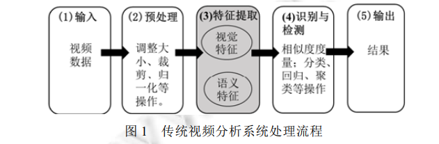 这一流程可以分为数据输入、预处理、特征提取、识别与检测、结果输出这 5 个部分, 其中, 特征提取是传统视频分析系统的核心部分。这些要提取的特征可以分为视觉特征和语义特征两大类: 视觉特征即图像通过线性变换得到的特征。例如, 颜色、纹理、形状等; 语义特征则是通过分析图像中事物与事物之间的关系, 从中提取出的对象、事件等高级概念。例如, 足球比赛的观众席上有一位球迷看起来很兴奋。显然, 这两类特征的含义不同, 因此, 对这两类特征的提取要求是不同的。根据提取特征的不同, 可将传统视频分析系统分为基于内容查询(content-based image retrieval, CBIR)的系统和基于语义查询的系统这两类。其中, 基于内容查询的系统具有代表性的有QBIC[9]、Virage[10]、PhotoBook[11]、FourEyes[12]、VisualSEEK[13]等。