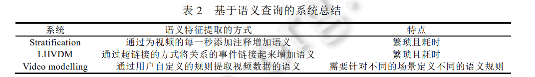 基于这种查询需求,研究者开发了Stratification[15]、LHVDM[16]、Video modelling[14]等基于语义查询的系统。这些系统的查询流程与基于内容查询的视频分析系统类似。表 2 总结了这些系统提取语义特征的方式以及各个系统的特点。一般而言, 这些系统都要求研究者拥有领域知识且明确用户需求, 研究者对相关领域知识的不了解和对用户查询内容的不清楚, 会导致最终结果的不准确。