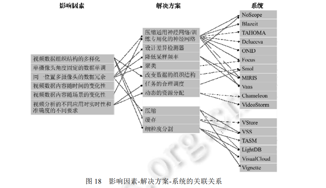 本节首先通过图 18 展示了新型视频分析系统与性能影响因素以及解决方案之间的关系; 然后, 本节从多个维度出发, 总结并分析了针对计算进行优化的系统和针对存储进行优化的系统; 最后, 本节总结了当前系 统研究存在的不足, 为之后的研究人员提供一定的参考。