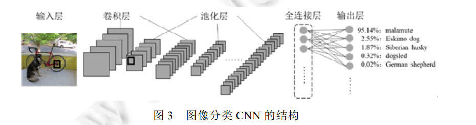 深度神经网络的出现和深度学习的发展, 为视频分析系统提供了新的方向。深度学习的概念最开始由 Hinton[18]提出, 它的提出来源于人们对人工神经网络的研究, 其动机在于模拟人脑的机制来自动学习数据样本的特征。早期虽然也有人尝试利用一些通用的神经网络进行视频分析, 但是由于其深度太浅, 只能用于识别检测包含单一目标的图像[19]。而且由于缺乏大规模的训练数据, 在利用这些浅层神经网络实现的应用中会出现过度拟合等现象[20], 导致查询效果不如传统的视频分析系统。直到 2012 年, AlexNet[8]在 ImageNet 比赛上得到了最好的结果, 当时, AlexNet识别效果超过了所有浅层的方法, 深度神经网络开始发展起来。图3展示了一个深度神经网络的结构, 该网络由输入层、卷积层、池化层、全连接层和输出层组成[21]。 其中, 卷积层和池化层是该深度神经网络中用于特征提取的核心模块。网络的每一层都可以用来自动提取图像不同的特征, 较低层会检测基本特征, 较高层则可检测更复杂的特征。此后, 随着可供神经网络训练的数据规模越来越大, 神经网络训练过程中过拟合等问题得到缓解, 复杂的网络结构应运而生[22,23]。例如, GoogLeNet[24]、Resnet[25]、 Yolo[26]等。在深度神经网络研究的基础上, 深度学习开始受到广泛的关注。
