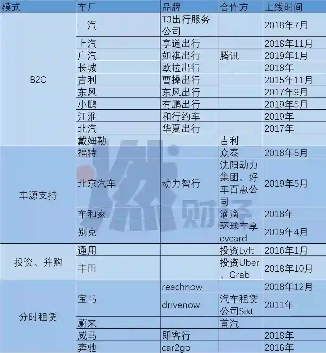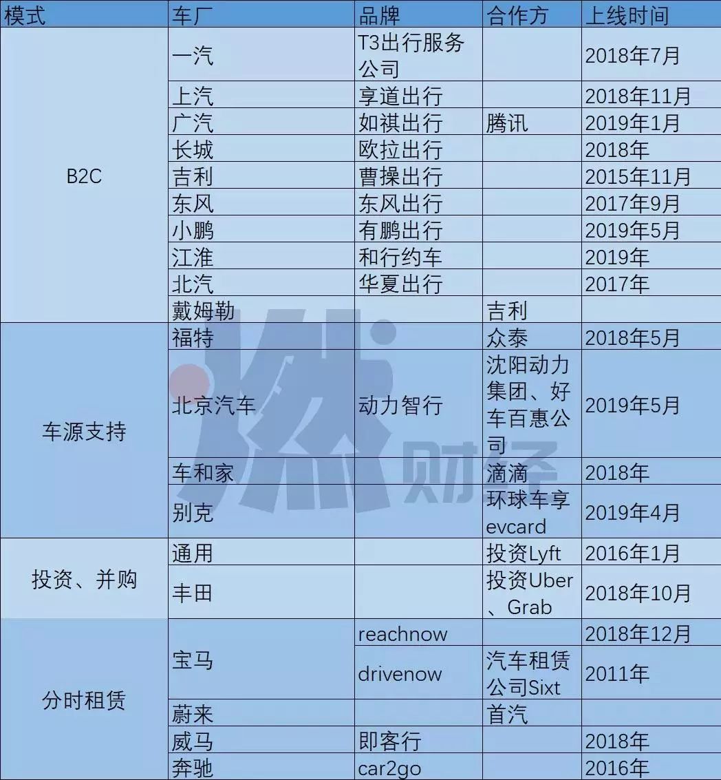前来搅局的不止上汽一家,从2011年至今共有20家车企悉数布局网约车。不同的是,有些车企以B2C、C2C、分时租赁的方式亲自下场,有些车企则通过投资并购入局,有些则仅仅提供车源支持。