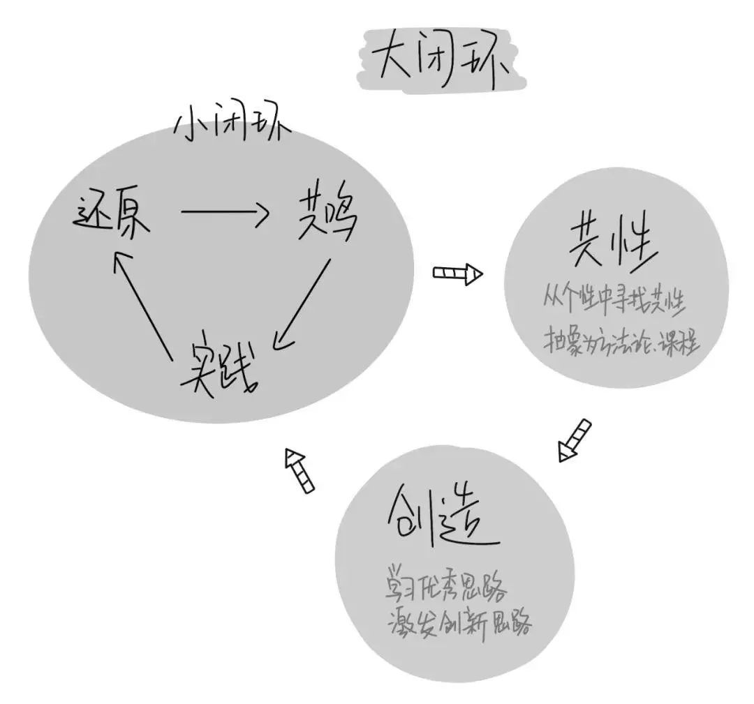 分享者还原个性的经验,学习者从个性中找到共鸣,平台从所有的分享和数据中找到用户的共性问题,提炼成方法论、组织系统化学习。学员可以通过系统化学习再次提升自己的学习能力,激发新的创造力,然后回到社区再分享。