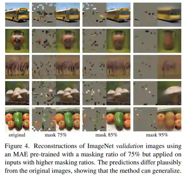 为了克服这种差异并鼓励学习有用的特征,研究者展示了:一个简单的策略在计算机视觉中也能非常有效:掩蔽很大一部分随机 patch。这种策略在很大程度上减少了冗余,并创造了一个具有挑战性的自监督任务,该任务需要超越低级图像统计的整体理解。下图 2 - 图 4 展示了这一重建任务的定性结果。