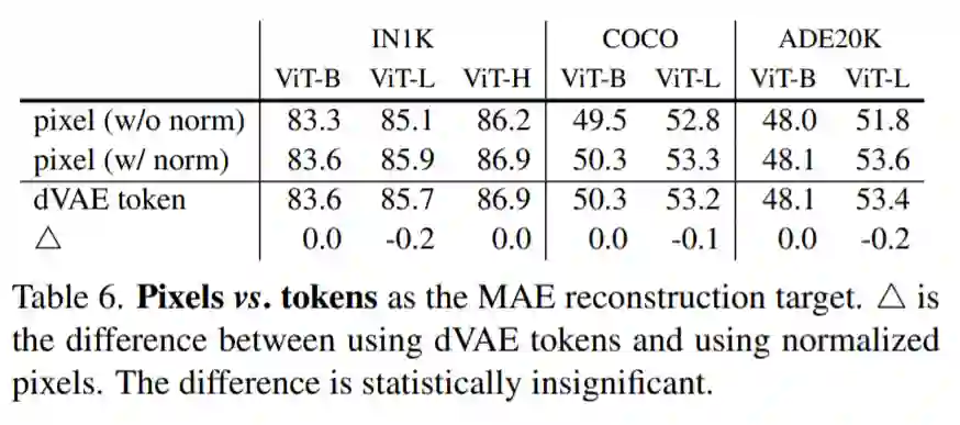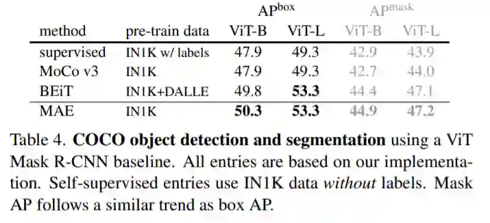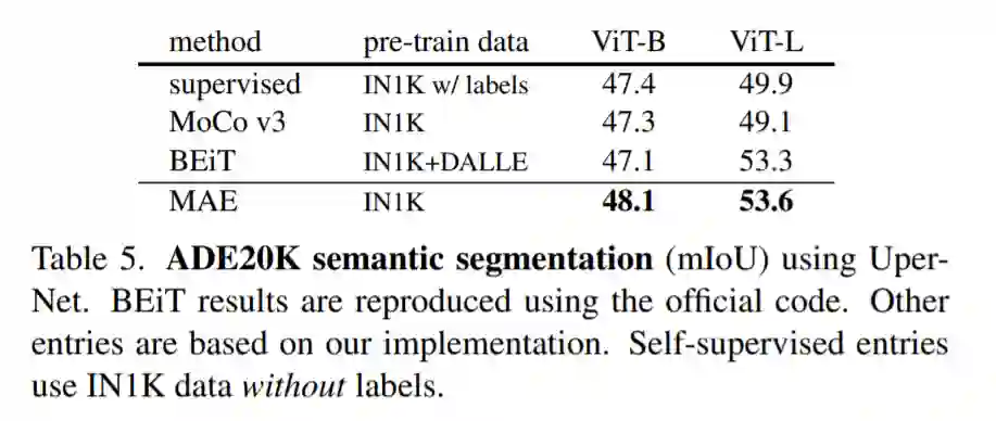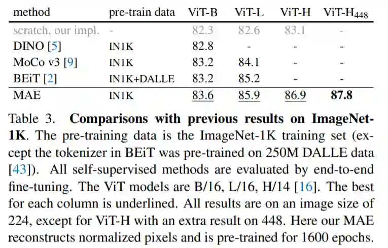 作者认为,这种可扩展方法允许学习泛化良好的高容量模型:例如在仅使用 ImageNet-1K 数据的方法中,vanilla ViT-Huge 模型实现了最佳准确率 (87.8%)。在下游任务中的传输性能优于有监督的预训练,并显示出可观的扩展能力。