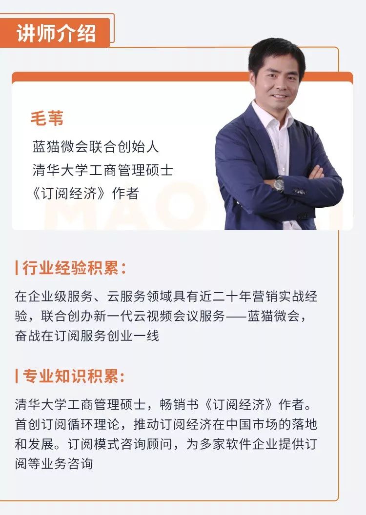 毛苇老师将在企业级服务、云服务领域的20年营销实战经验和订阅模式咨询案例,精炼成一门课,只为帮你厘清订阅模式的本质,把握订阅经济的未来。