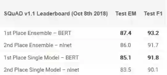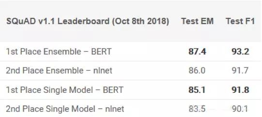 不少专家声称BERT的发布标志着NLP的新时代。继ULMFiT和ELMo之后,BERT凭借其性能真正击败了竞争对手。正如原论文所述,“BERT在概念上更简单且更强大”。BERT在11个NLP任务中获得了最先进的结果,在SQuAD基准测试中查看他们的结果: