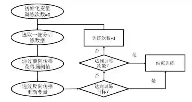 TensorFlow是一个基于神经网络的深度学习框架。对于Softmax这样的模型,被当作是不含隐藏层的全连接神经网络。通过调整神经网络中的参数对训练数据进行拟合,可以使得模型对未知的样本提供预测的能力,表现为前向传播和反向传播(Backpropagation)的迭代过程。在每次迭代的开始,首先需要选取全部或部分训练数据,通过前向传播算法得到神经网络模型的预测结果。
