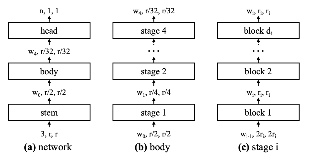 给定输入图像,接下来是一个包含简单主干的网络,再接下来是执行大量计算的网络主体,最后是预测输出类别的网络头。本文保持主干和头部网络尽可能简单,主要关注网络网络主体的结构。可以看到这里网络主体由4个阶段(stage)组成,并且分辨率逐渐降低,然后每个stage里面又是由一系列相同的块(block)组成。在这个结构里面,可以改变的参数包括块的数量
