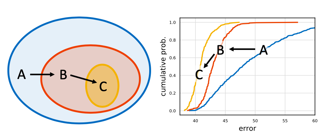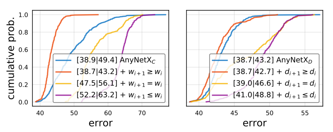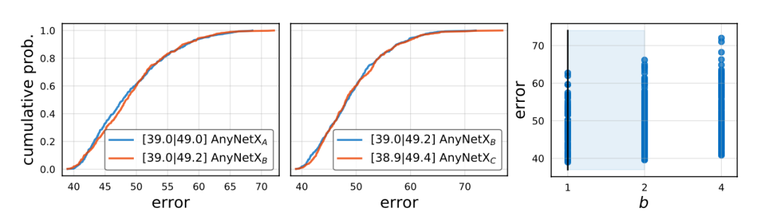 先来看一下设计空间设计的工具,为了评估和对比设计空间,这里使用Radosavovic等人介绍的工具。他提出通过从设计空间采样一组模型,并描述由此产生的模型误差分布,来量化设计空间的质量。这种方法背后的关键是,与使用搜索和比较两个设计空间中的最佳模型相比,比较分布更加可靠且信息更丰富。