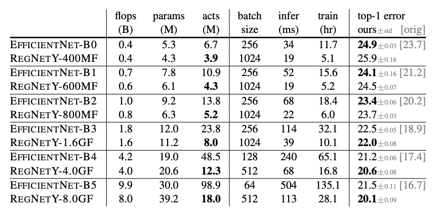 下面的Table4展示了论文将RegNet和SOTA EfficientNet 模型的对比结果,结果显示在相似的训练设置和FLOPs下,RegNet优于EfficientNet模型,并且 GPU 上的速度提升5倍。