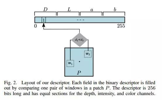 图2 描述符的布局。 通过比较补丁P中的一对窗口来填充二进制描述符中的每个字段。描述符有256位并且具有用于深度,强度和颜色通道的相等部分。