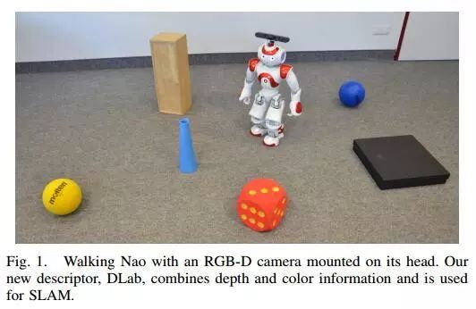 图1 步行机器人Nao,其头部安装了RGB-D摄像头。 我们的新描述符DLab结合了深度和颜色信息并用于SLAM。