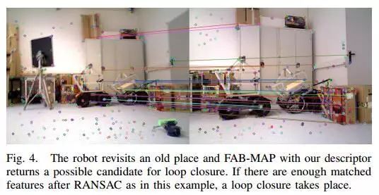 图4 机器人重新访问一个旧位置时,FAB-MAP使用我们的描述符返回一个可能的回环候选者。 如果在RANSAC之后有足够的匹配特征,则发生回环。