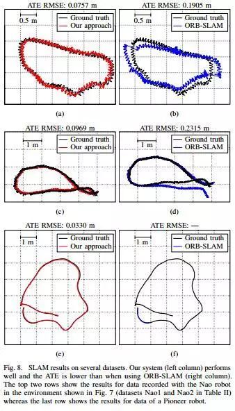 图8 SLAM在几个数据集上产生结果。 我们的系统(左栏)表现良好,ATE低于使用ORB-SLAM(右栏)时的情况。前两行显示了在图7所示环境中用Nao机器人记录的数据结果而最后一行显示了Pioneer机器人的数据结果