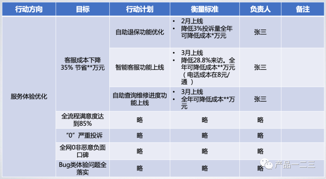 另外选取“服务体验优化”主题向下分解,形成以下的行动计划表: