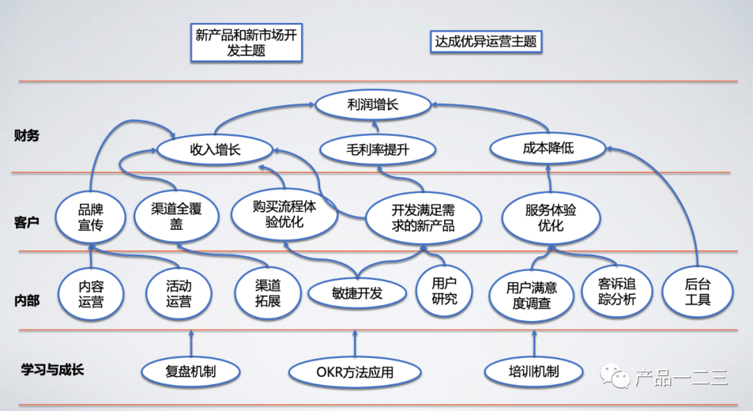 各层之间的要素要有因果关系,可以展示战略主题实现过程中的因果关系,帮助团队成员对战略全局有直观、生动的理解,了解各自对于整体战略的贡献;