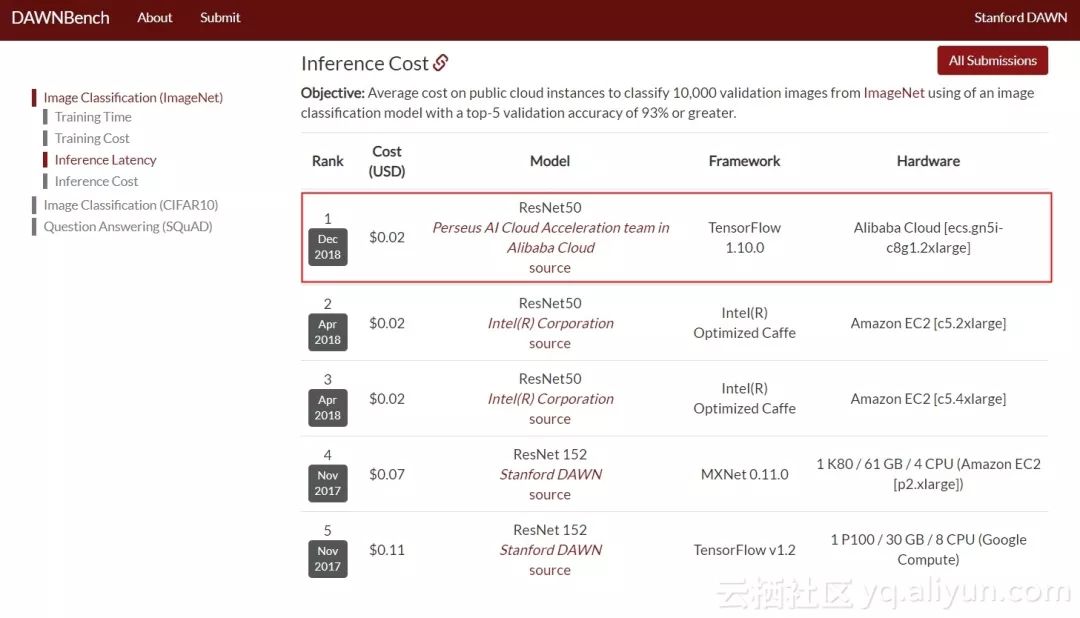 云栖君导读:2018年12月25日,斯坦福大学发布最新的DAWNbench深度学习推理榜单,阿里云获得了图像识别性能及成本双料冠军。本文将深度解读背后的技术秘密。