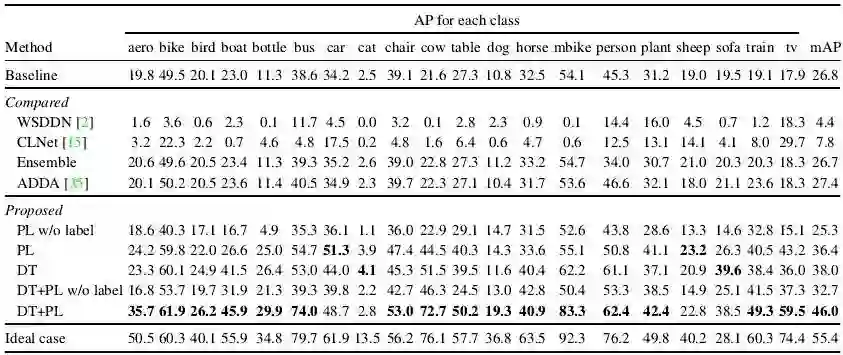 实验采用的检测器是SSD300,作者是在Chainer这个框架下实现的,并公开了源码。此外作者还和两种弱监督的目标检测方法以及一种域适应方法进行实验对比。对比结果如下图所示: