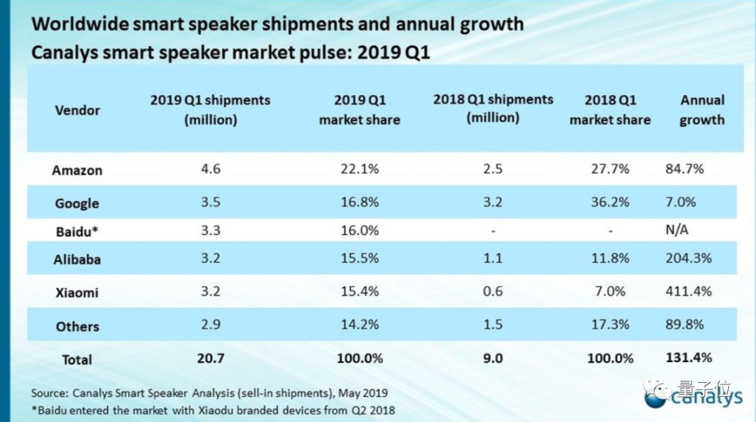 市场分析公司Canalys数据显示,2019第一季度,小度智能音箱的出货量仅次于谷歌及亚马逊,成为中国市场第一,全球市场第三。