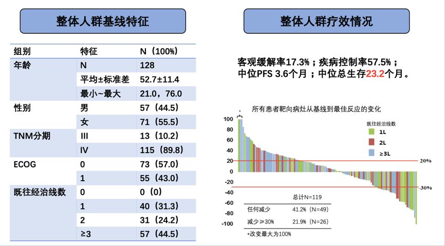 POLARIS-01研究入组二线及二线以上晚期转移性黑色素瘤患者。由北京大学肿瘤医院郭军教授主持,在国内多个黑色素瘤中心共计入组128例患者,其中一线治疗失败的患者是31.3%,二线及二线以上的患者占比68.7%。目前最新的研究数据显示,整体人群中ORR为17.3%,DCR为57.5%,中位PFS为3.6个月,而中位OS为23.2个月(图4)。