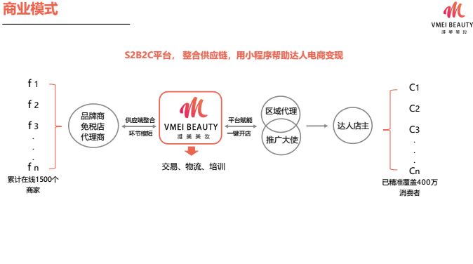 做供应链赋能、SaaS赋能、服务赋能、学习赋能、培训赋能以及商业赋能等,把这些都赋能给小B(注:小B就是唯美美妆平台上的美妆达人)。