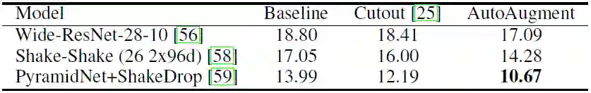 表 2:在 CIFAR-100 上的测试集误差率(%)。本文的实验复现了 Wide-ResNet 和 ShakeDrop 的基线模型和 Cutout 模型结果,并且与之前报告的结果 [25,59] 相匹配。请注意,在简化 CIFAR-10 上找到了最佳的策略。