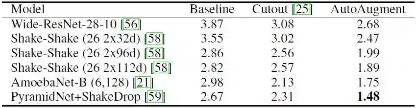 作者提出的方法在 CIFAR-10、简化的 CIFAR-10、CIFAR-100、SVHN、简化的 SVHN,以及 ImageNet(不添加额外数据)等数据集上取得了目前最高的准确率。在 CIFAR-10 上的误差率为 1.48%,比之前最先进的模型 [21] 的误差率低 0.65%。在 SVHN 上,作者将目前最低的误差率从 1.30% [25] 降低到了 1.02%。在简化数据集上,本文提出的方法取得了和不使用任何非标注数据的半监督方法相当的性能。在 ImageNet 数据集上,作者提出的方法达到了 83.54% 的 Top-1 准确率。最后,作者展示了在一个任务中找到的策略可以很好地泛化到不同的模型和数据集上。例如,在 ImageNet 上发现的策略能在各种各样的 FGVC 数据集上带来显著的性能提升。即使在那些对在 ImageNet 上预训练好的权重进行调优也帮助不大的数据集上 [26],例如 Stanford Cars [27] 和 FGVC Aircraft [28],使用 ImageNet 上的策略训练可以分别减少 1.16% 和 1.76% 的误差率。这一结果表明迁移数据增强策略为迁移学习提供了一种新的可选方案。