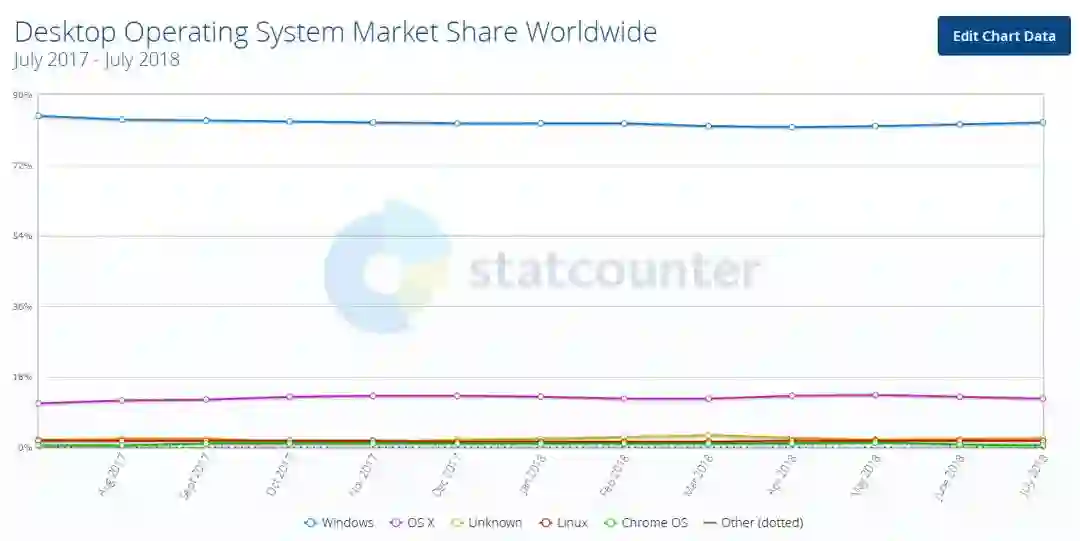 据网站通讯流量监测机构 StatCounter 数据显示,如今 Windows 在桌面操作系统依旧是稳打稳的霸主,占据 82.88% 的市场份额。