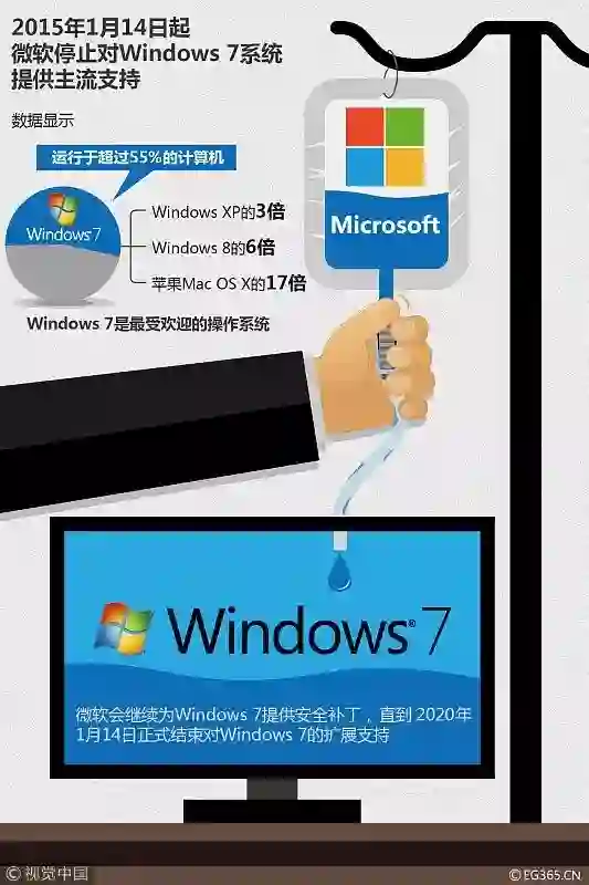 2015 年 1 月 14 日,微软正式终止对 Windows 7 的主流支持,但是仍然继续为 Windows 7 提供安全补丁支持;2020 年 1 月 14 日,微软即将结束对 Windows 7 的所有支持。