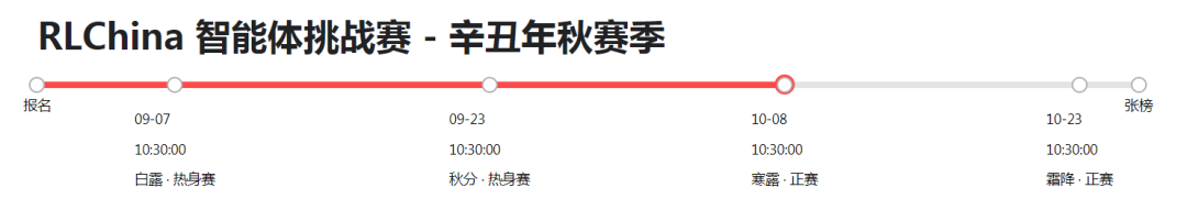 为汇聚广大智能体算法爱好者的智慧共同解决决策智能学术和应用难题,“及第”平台将按照中国农历每季度举办一次“RLChina智能体挑战赛”,面向所有对智能体算法感兴趣的学生、科研工作者和行业从业人员。辛丑年秋赛季于2021年8月31日至10月23日举行,赛程包括两次热身赛和两次正赛,四场比赛分别在中国农历节气白露、秋分、寒露(今日)、霜降举行。