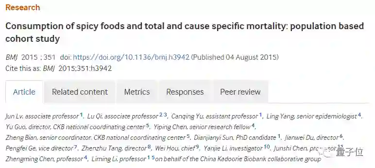 一项关于吃辣和死亡率的研究在《英国医学杂志》(BMJ)上发表,名为《Consumption of spicy foods and total and cause specific mortality: population based cohort study》。