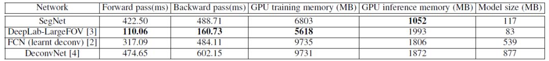SegNet在训练和测试期间的内存要求都很低。并且模型尺寸比FCN和DeconvNet小得多。