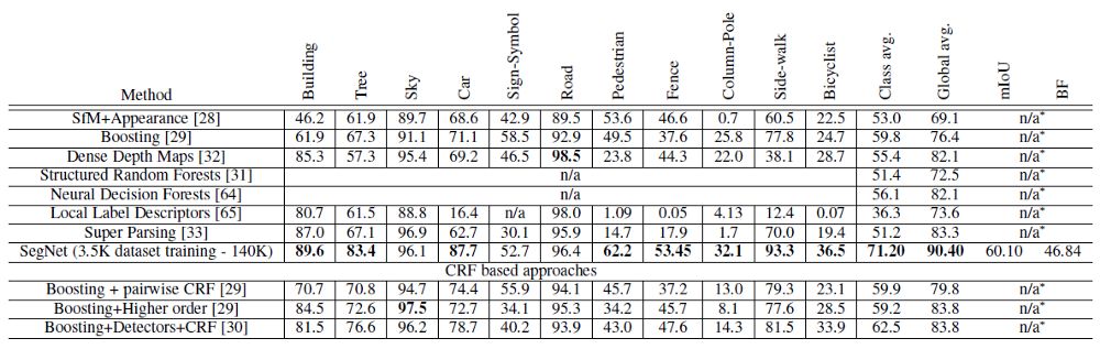 道路场景分割的CamVid数据集上,与传统方法相互比较