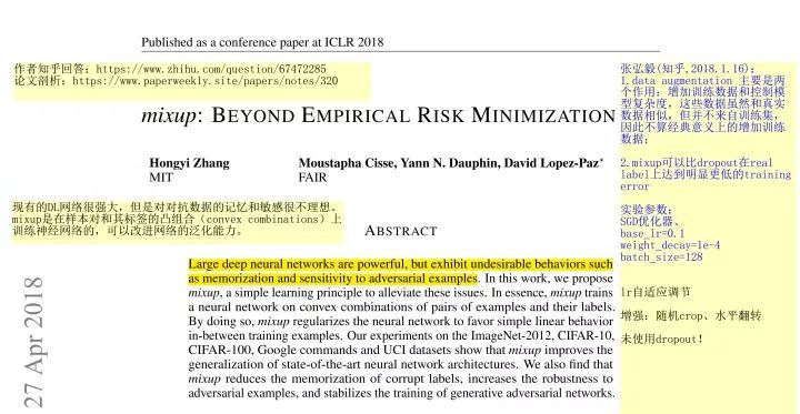 (https://arxiv.org/abs/1710.09412),可以在无额外计算开销的情况下稳定提升1个百分点的图像分类精度。